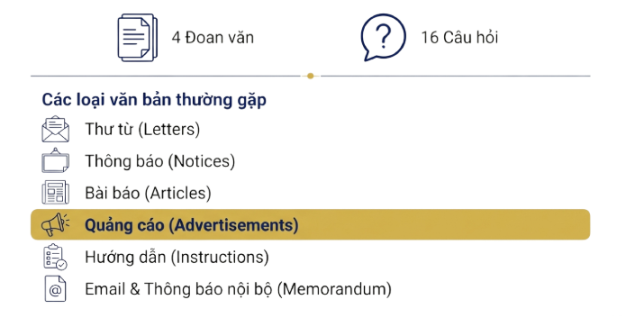 Trong cấu trúc đề thi TOEIC, các bài đọc về quảng cáo không chỉ kiểm tra vốn từ vựng mà còn thử thách khả năng nắm bắt thông tin ưu đãi nhanh chóng. Tại Aura English, chúng tôi phân loại dạng này thành 3 nhóm nội dung chính: