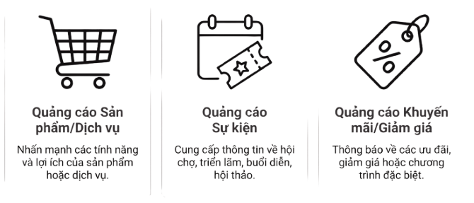 Nội dung: Thường là thông báo về hội chợ thương mại, triển lãm sản phẩm, buổi biểu diễn, hội thảo chuyên đề hoặc các cuộc thi.
