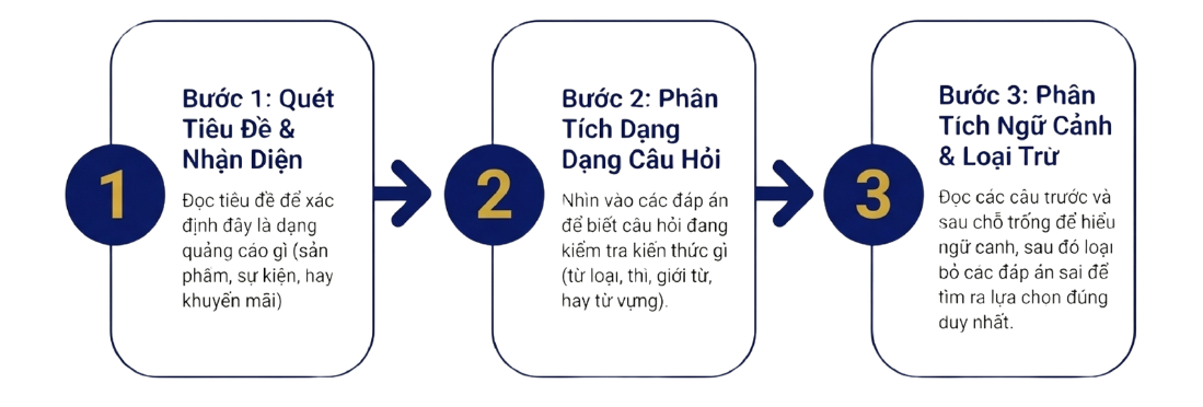 Để giúp các bạn học viên tối ưu hóa thời gian và đạt điểm số cao nhất, Aura English xin hướng dẫn quy trình 3 bước xử lý "gọn gàng" dạng bài Quảng cáo trong TOEIC Reading Part 6: