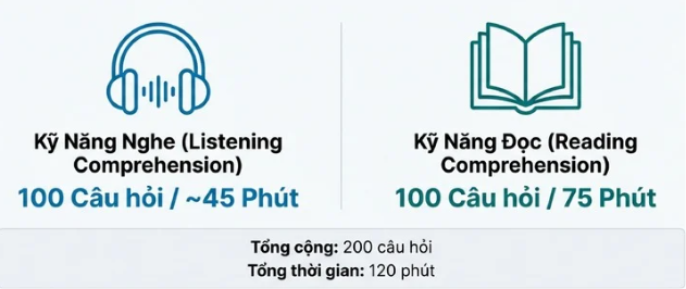 Cấu trúc bài thi TOEIC 2 kỹ năng Nghe - Đọc gồm 200 câu hỏi và thời gian làm bài thi TOEIC là trong 120 phút. Trong đó phần Nghe (Listening) có thời gian làm bài thi là 45 phút và phần Đọc (Reading) là 75 phút.