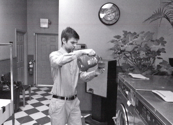 (C) Anh ấy đang đổ một ít chất lỏng vào cốc.