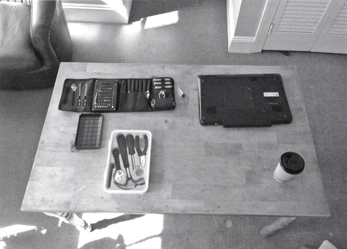 D. He is washing the desk. (Anh ấy đang lau dọn bàn làm việc).